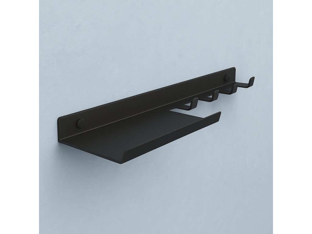 Tento věšák na klíče s poličkou vám pomůže udržet pořádek a mít vše důležité vždy po ruce. Díky čtyřem háčkům už nikdy nebudete hledat klíče po kapsách či taškách. Horní polička navíc nabízí praktické místo na drobnosti, které potřebujete při odchodu z domu. Minimalistický design a černá barva se snadno sladí s jakýmkoli interiérem.